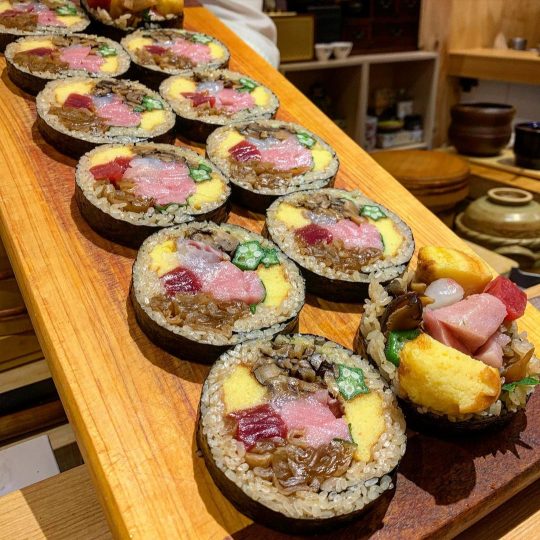 - 후기(식신 나마스떼): 메뉴가 나올 때마다 와사비, 트뤼프 소금, 히말라야 소금 등 어떤 소스랑 잘 어울리는지 설명해 주셔서 더욱 맛있게 먹은 것 같습니다. 김 위에 밥을 깐 뒤 크림치즈, 새우튀김, 연어, 교꾸, 네기도로를 넣고 싼 후토마끼는 크림치즈의 진득함이 맛의 균형을 잡아주는 느낌이에요!