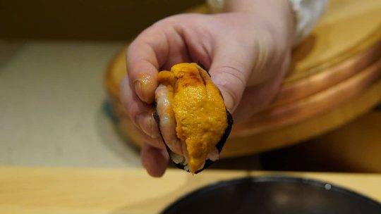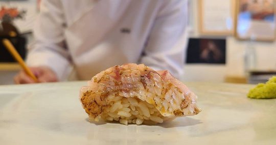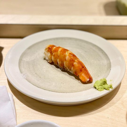 테이블 앞에는 스시의 맛을 한층 살려줄 와사비, 히말라야 소금, 트뤼프 소금, 간장이 준비되어 있어 입맛대로 찍어 먹으면 된다. 금태를 토치로 살짝 그을려 샤리 위에 얹어 나오는 ‘금태 스시’가 많은 사랑을 받는다. 녹아내린 지방층으로 풍미를 끌어올린 금태에 불 맛을 가미하여 깊은 고소함을 느낄 수 있다.