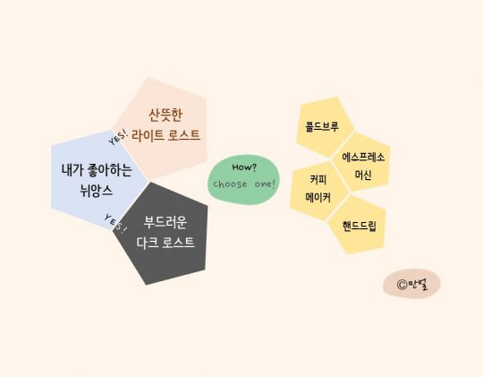 사실 내가 만들어 먹는 커피를 선택한다는 것은 굉장히 주관적인 선택의 과정이기 때문에 '어떤 커피가 좋다' 또는 '어떤 커피가 나쁘다'라는 식의 표현은 할 수 없을 것 같습니다. 누군가는 아주 진하게 추출되는 다크 로스트 커피가 좋을 수도 있고 누군가는 산미가 두드러지는 라이트 로스트 커피가 좋을 수도 있습니다.