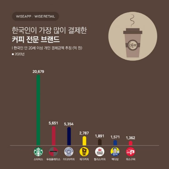 와이즈앱이 제공한 자료에 따르면 스타벅스에서 결제한 금액은 2020년 한 해 동안만 무려 2조 원에 달합니다. 추정금액이라 실제 매출인 1조 9,284억 원과 다소 차이는 있지만, 올해는 매출로도 2조 원 돌파가 유력한데요. 2016년 커피 전문점 최초로 1조 원 매출을 돌파한 데 이어 대기록 달성을 눈앞에 둔 겁니다.