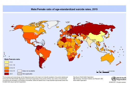 자살 현상에서 나타나는 중요한 특징 중 하나는 남성의 자살률이 여성보다 월등히 높다는 것이다. 세계보건기구에서 발행한 최신 통계에 따르면, 인구 10만 명 당 남성 자살률은 13.7명인데 반해 여성은 7.5명으로 남성의 자살률이 2배 가까이 높았다. 자살률에서의 성차는 남성 대 여성의 자살비(Male : Female ratio)로 표현하는데, 일반적으로 고소득 국가에서는 이 값이 3에 가까워 남성의 자살률이 훨씬 높고, 중간소득 이하 국가들에서는 성별로 큰 차이가 없는 것으로 나타난다.