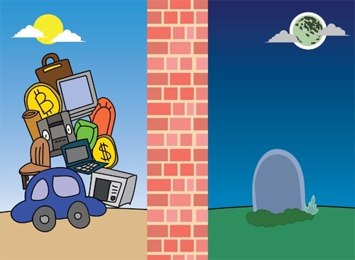 그래서 여기에 엄청난 관계가 놓여 있다. 돈이란 삶에 살아가는 데 필요하지만, 죽음 앞에서는 아무런 의미가 없다. 이 관계를 보통 사람들에게 어떤 모습인지 설명하자면, 아래와 같은 모습이다.