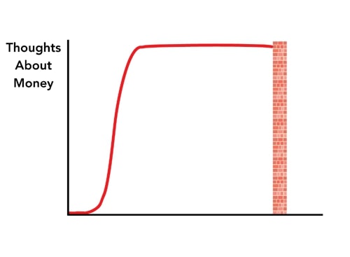 좋게 들리지만 이것만으로는 충분하지 않다. 많은 사람은 돈의 헛됨을 훨씬 더 늦게 깨달아도 된다고 믿는다. 극단적 절약을 통해 40대 초반까지 경제적 자유를 얻어 조기 은퇴를 희망하는 파이어(Financial Independence, Retire Early; FIRE) 같은 운동은 돈의 중요성을 떨어뜨리는 시점을 훨씬 앞당기는 것이며 다음 같은 곡선을 그린다.