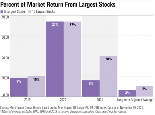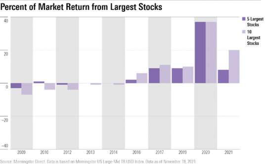 지난 10년 대부분 동안, 대형주의 주식시장 수익률 기여도는 꾸준히 증가해 왔다. 주식시장 전체 수익률에서 상위 5대 종목이 차지하는 비중은 2016년 6%에 불과했지만, 2017년 9%로 높아졌다. 그리고 2019년의 경우, 상위 10대 종목이 주식시장의 연간 수익률 31% 중 10%를 담당했다.