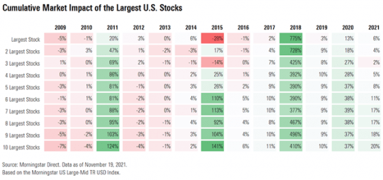 수익률 집중 현상이 어느 정도인지 알아보기 위해, 시가총액 상위 10대 종목이 주식시장의 90%를 추적하는 지수(Morningstar US Large-Mid Index)에 미치는 영향을 계산했다. 2009년 이후 매년 연말 시가총액 상위 10대 종목을 선별하고, 지수의 수익률에서 이들의 수익률을 배제해, 연도별로 각 수익률을 비교했다.