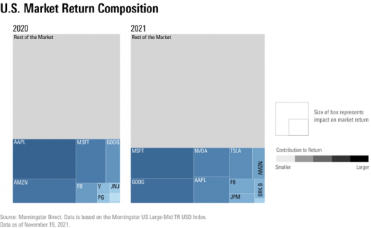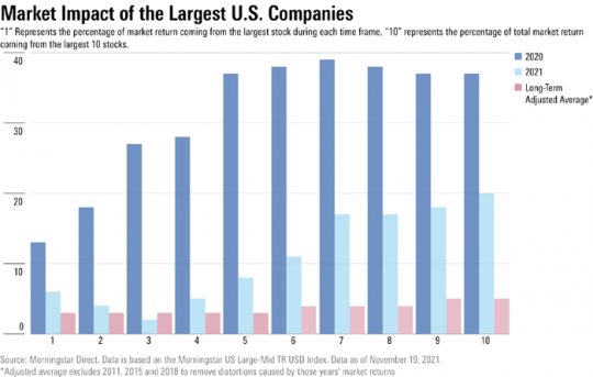 올해에도 상위 5대 종목이 여전히 주식시장 수익률에 평균 이상의 기여를 하고 있지만, 집중 현상은 떨어졌다. 비중 5.75%를 자랑하는 2021년 최대 기업 마이크로소프트는 11월 19일 기준 주식시장 수익률 25.5% 중 9%를 담당하고 있다. 지수에서 두 번째로 큰 주식인 애플은 21.7%의 수익률로 주식시장 수익률에 4%를 담당했다. 세 번째로 큰 종목인 아마존은 12.9%의 수익률을 기록하면서, 주식시장 수익률 중 2%를 담당하는 데 그쳤다.