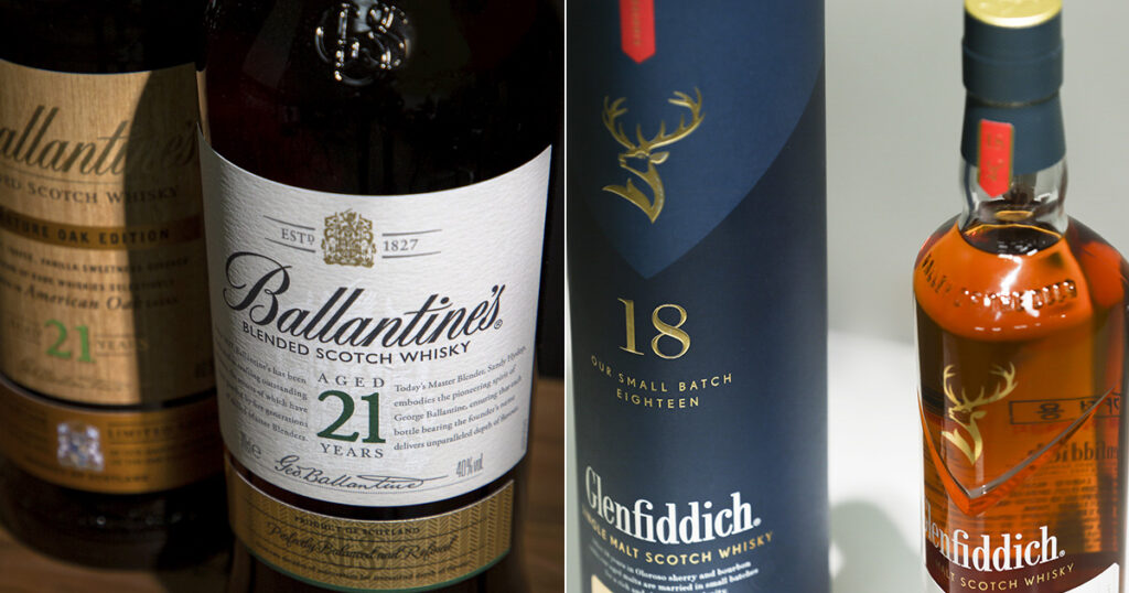 그리고 여기서 어떤 재료를 썼는가에 따라서 보리만 쓰면 ‘몰트위스키’, 그 외의 곡물을 쓰면 ‘그레인위스키’라고 불린다. 이걸 섞으면 ‘블렌디드 위스키’가 되는 것이고, 한 증류소의 몰트위스키만 가지고 만들면 ‘싱글몰트 위스키’가 되는 것이다. 잡곡밥과 흰쌀밥의 차이라고 할까(아니다).선물이나 입문용 위스키에 발렌타인, 조니워커를 부르는 이유
