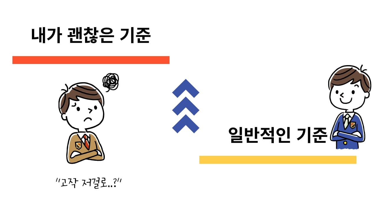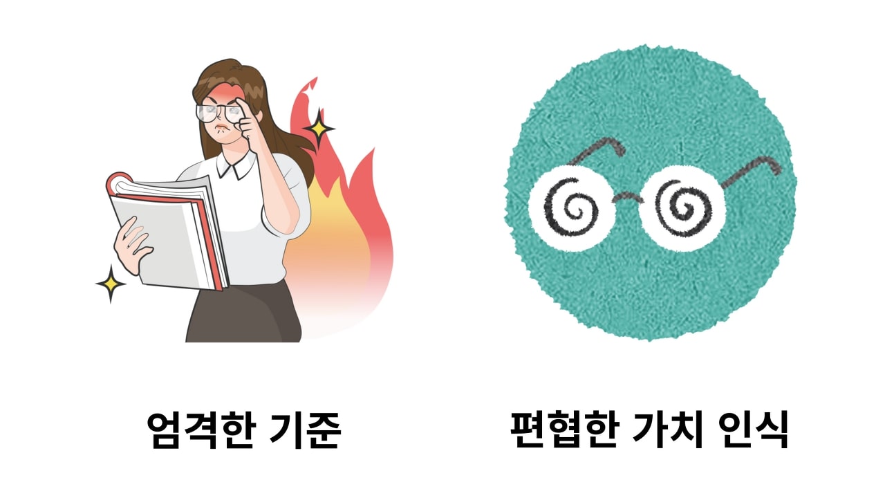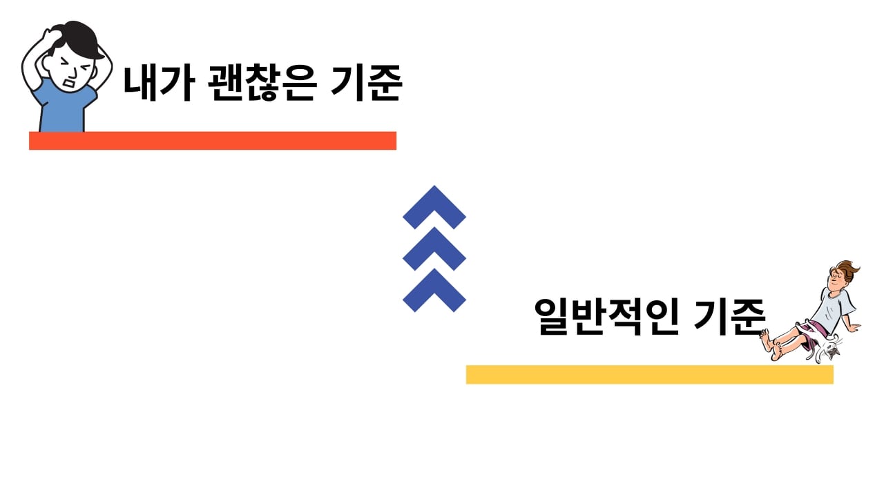 때때로 자기보다 훨씬 덜 하고 성과도 별로인데 만족하는 사람들이 한심해 보이기까지 합니다. “고작 그런 걸로 만족하냐”면서 말이죠. 이는 자신의 엄격한 기준을 상대방에게 적용하는 것이라 볼 수 있습니다.