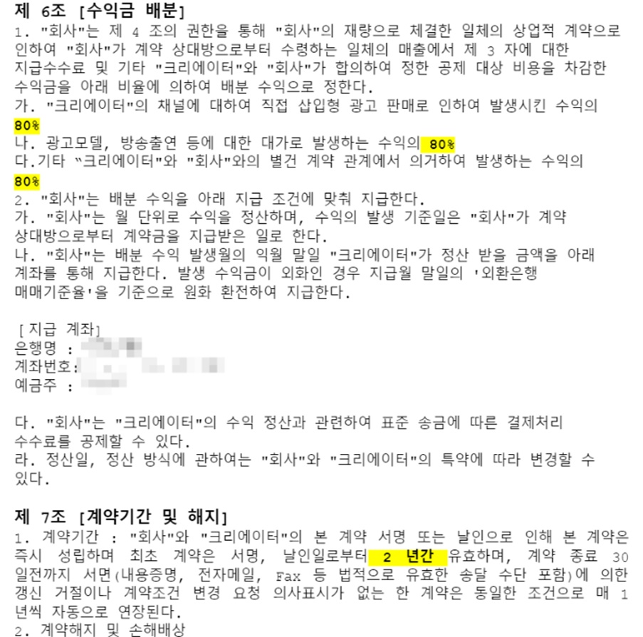 리: 허허… 틱톡커들 어릴텐데 상처받겠네요…하민: 네. 예전에 군소 MCN 많을 때, 이쪽에서 틱톡커 엄청 계약 많이 했거든요. 그때 힘들어한 틱톡커들이 되게 많아요. 2년 정도 묶여있는데, 광고는 꼭 회사 통해 받아야 하고, 단가 높으니 일은 안 들어오고, 회사는 탑 틱톡커만 챙기고… 그래서 애들은 계약 해지하고 싶어하는데, 심한 곳은 그때 계정을 넘기는 조항이 계약서에 있는 회사도 있었어요. 회사에서는 그 영상을, 가이드 위반되는지 테스트하는 계정으로 쓰고…