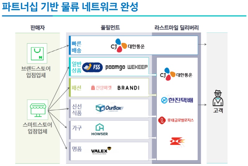 이처럼 과도한 비용을 경계하여, 풀필먼트의 단계 중 일부를 대행하는 경우는 매우 흔합니다. 특히 네이버의 경우, 네이버 풀필먼트 얼라이언스라는 개념을 만들어 아예 파트너십 기반으로 물류 네트워크를 만들기도 했고요.