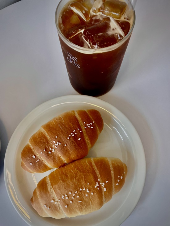 일단 아빠의 최애 음료, 캐러멜 마키아토도 아포가토도 없다는 상황을 설명하고 (동의를 가장한) 통보를 한 후 아이스 바닐라 라테를 주문했다. 잠시 후 고소한 냄새를 폴폴 풍기는 소금빵과 명도가 다른 석 잔의 커피가 우리 앞에 놓였다.
