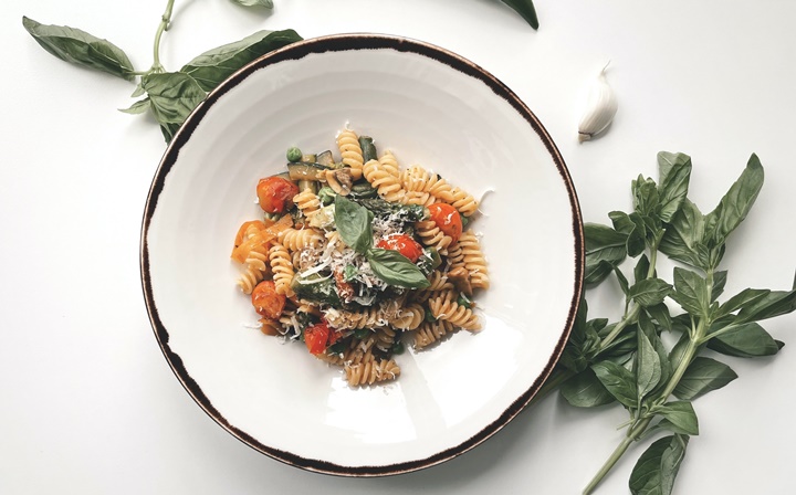 올리브 오일을 두른 팬에 편으로 썬 마늘을 볶다가 한입 크기로 자른 채소들, 삶은 면 순으로 넣고 볶는다. 뻑뻑한 감이 있어 미리 받아 뒀던 면수를 한 국자 넣으니 촉촉해졌다. 까만 후추와 빨간 페퍼론치노 가루와 초록 파슬리 가루를 뿌린 후 뒤적여 맛을 봤다.