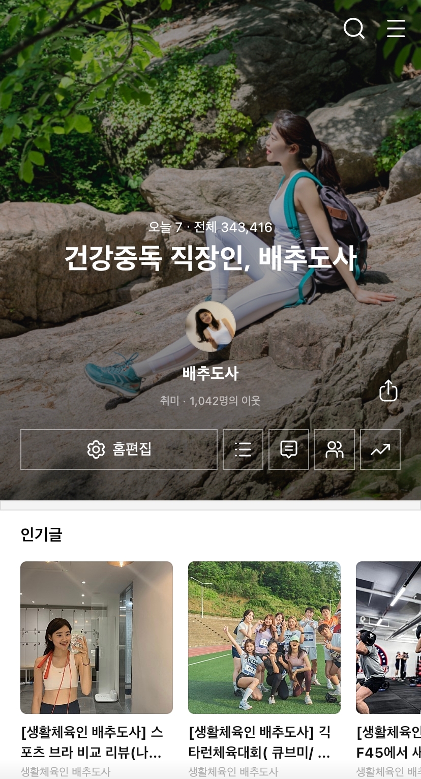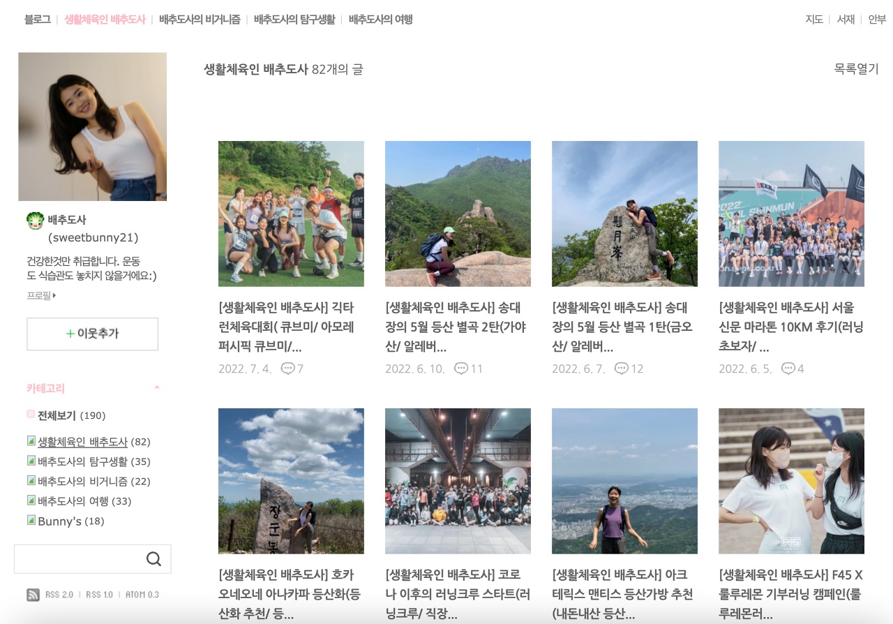 처음에는 '건강'이라는 포괄적인 주제 아래 채식, 운동, 책 읽기에 대한 게시물을 올렸다. 그런데 반응이 더 좋은 게시물과 내가 꾸준히 쉽게 포스팅할 수 있는 소재의 교집합이 생기면서, 자연스럽게 등산을 구체적인 주제로 선정하기 시작했다.