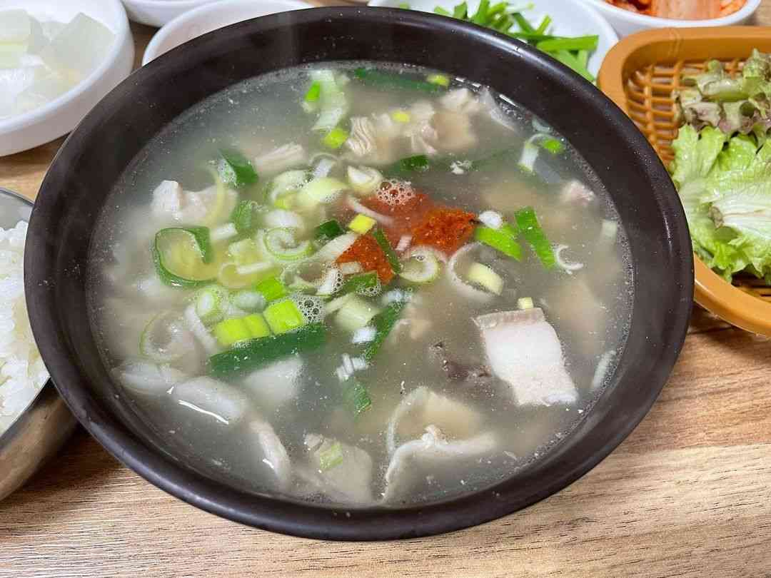 깔끔하고 맑은 국물은 담백함이 이루 말할 수 없고 고기는 수육처럼 부드럽다. 취향에 따라 새우젓과 부추, 다대기를 넣어 먹어도 새로운 맛을 느낄 수 있다. 밑반찬으로 내어주는 김치는 국밥과 궁합이 좋다.