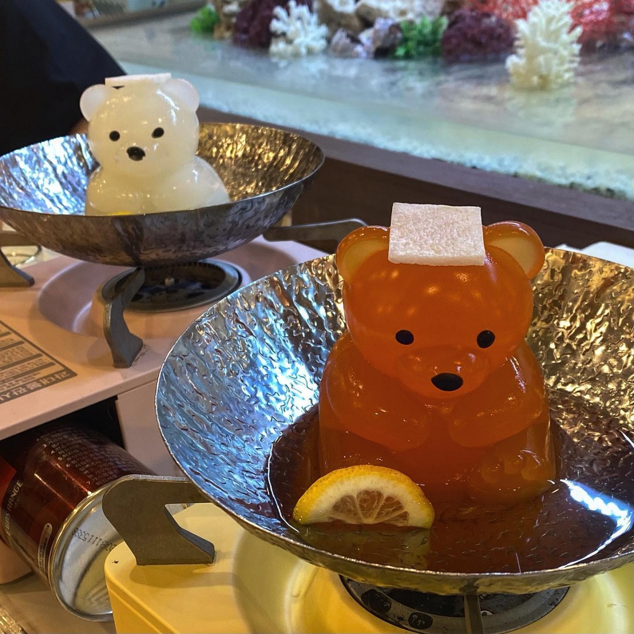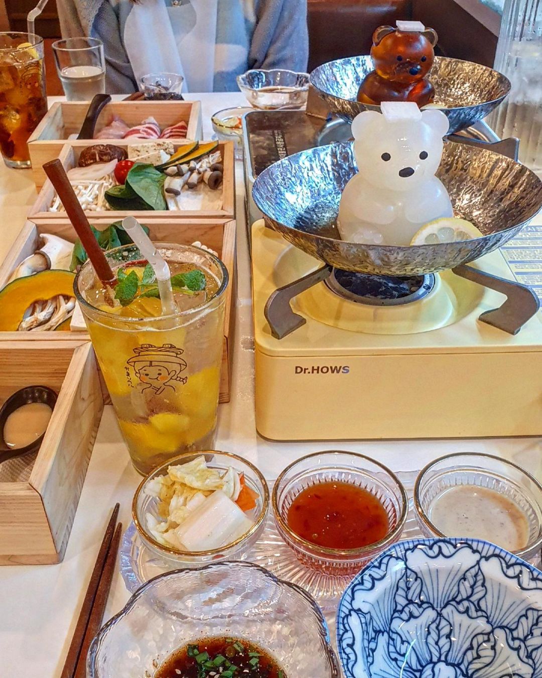 솥밥이 베이스이지만 대표메뉴로는 쿠마짱 온천 샤브샤브를 꼽는다. 콜라겐이 가득한 육수로 만든 거대한 젤리곰 모양의 곰돌이가 머리에 수건대신 무를 얹고 온천을 즐기는 모습으로 냄비에 앉아있다.