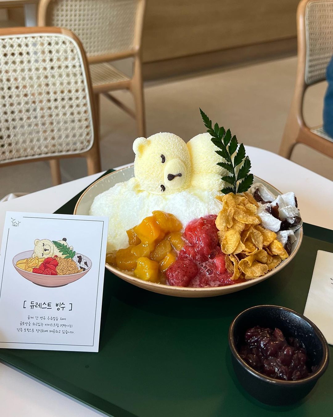 또 다른 곰돌이 디저트인 크로플과 빙수에는 복슬복슬한 털이 만져질 것 같은 정교한 곰돌이 모양의 아이스크림이 올라간다. 아이스크림은 바닐라와 초코 중에 선택이 가능하다.