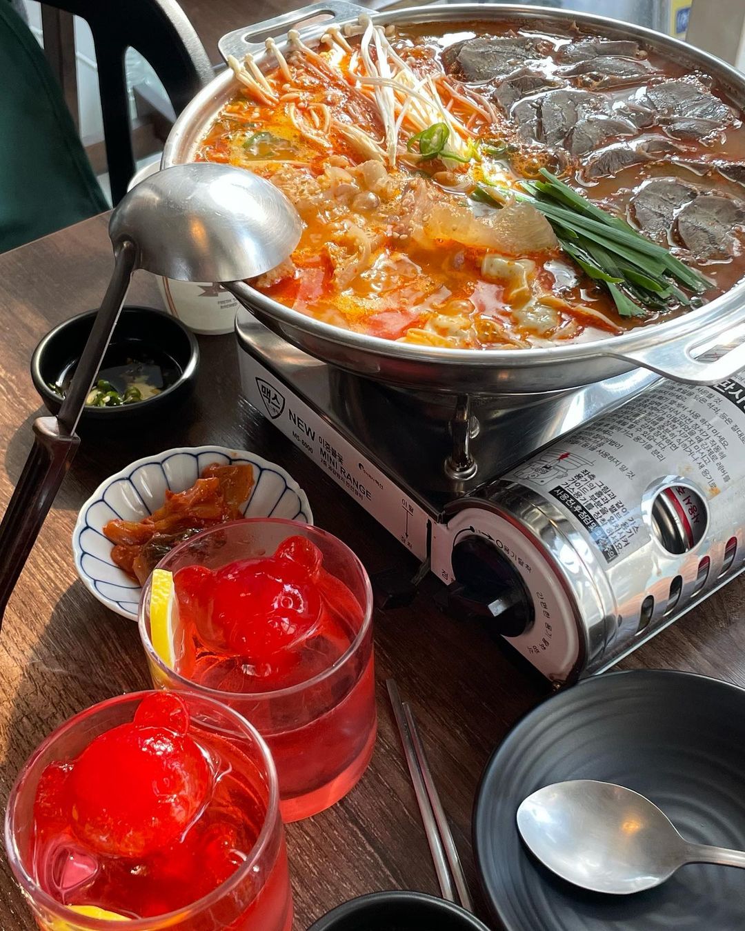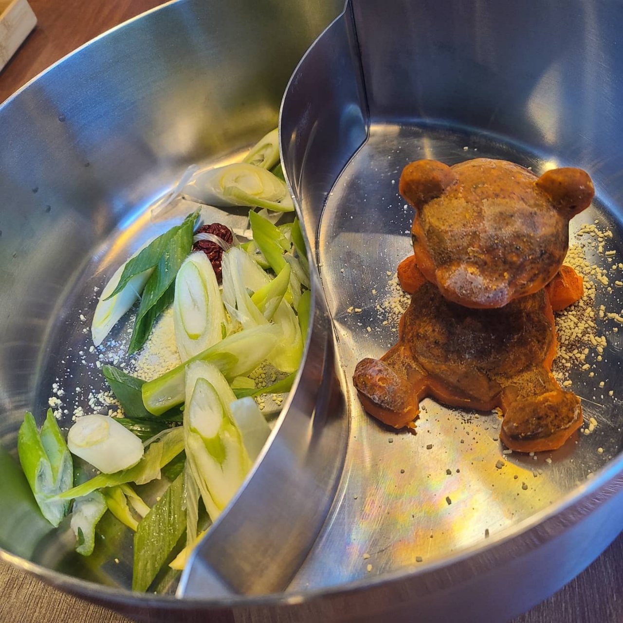 빨간색 곰돌이로 등장한 고추기름에 하얀 백탕 육수를 부으면 처음에는 반신욕을 하던 곰돌이가 점점 녹으며 뒤로 누워 배영을 한단다. 배영을 하던 곰돌이의 모습이 보이지 않게 다 녹으면, 다양하게 준비된 채소와 고기를 넣어서 먹으면 된다. 홍탕 육수에는 이 빨간색 곰돌이가 맛의 핵심이라니 맛있는 홍탕을 위해서라면 아쉽지만 곰돌이와 작별할 수밖에 없다.