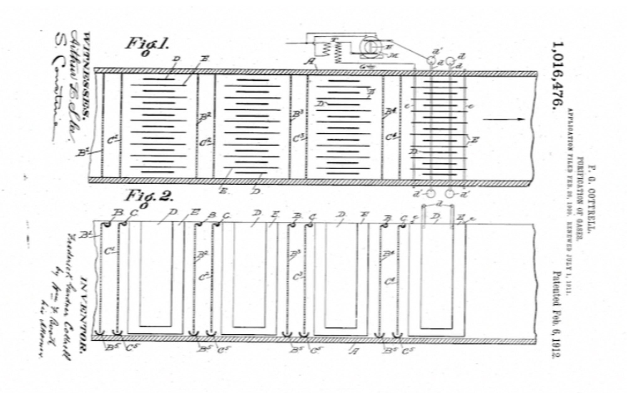 이 문제를 해결하기 위해 1912년 미국의 과학자 프레드릭 코트렐(Frederick G. Cottrell) 박사가 전기집진기를 발명합니다. 이 전기집진기는 화력발전소 굴뚝에 부착하는 것으로, 정전기를 이용해 초고열의 미세한 연기 입자들을 걸러낼 수 있었죠.
