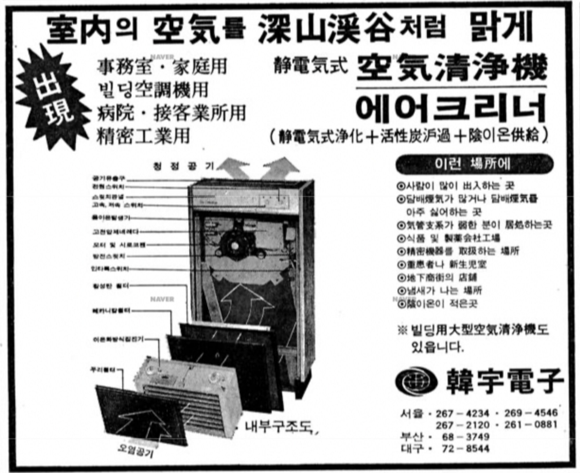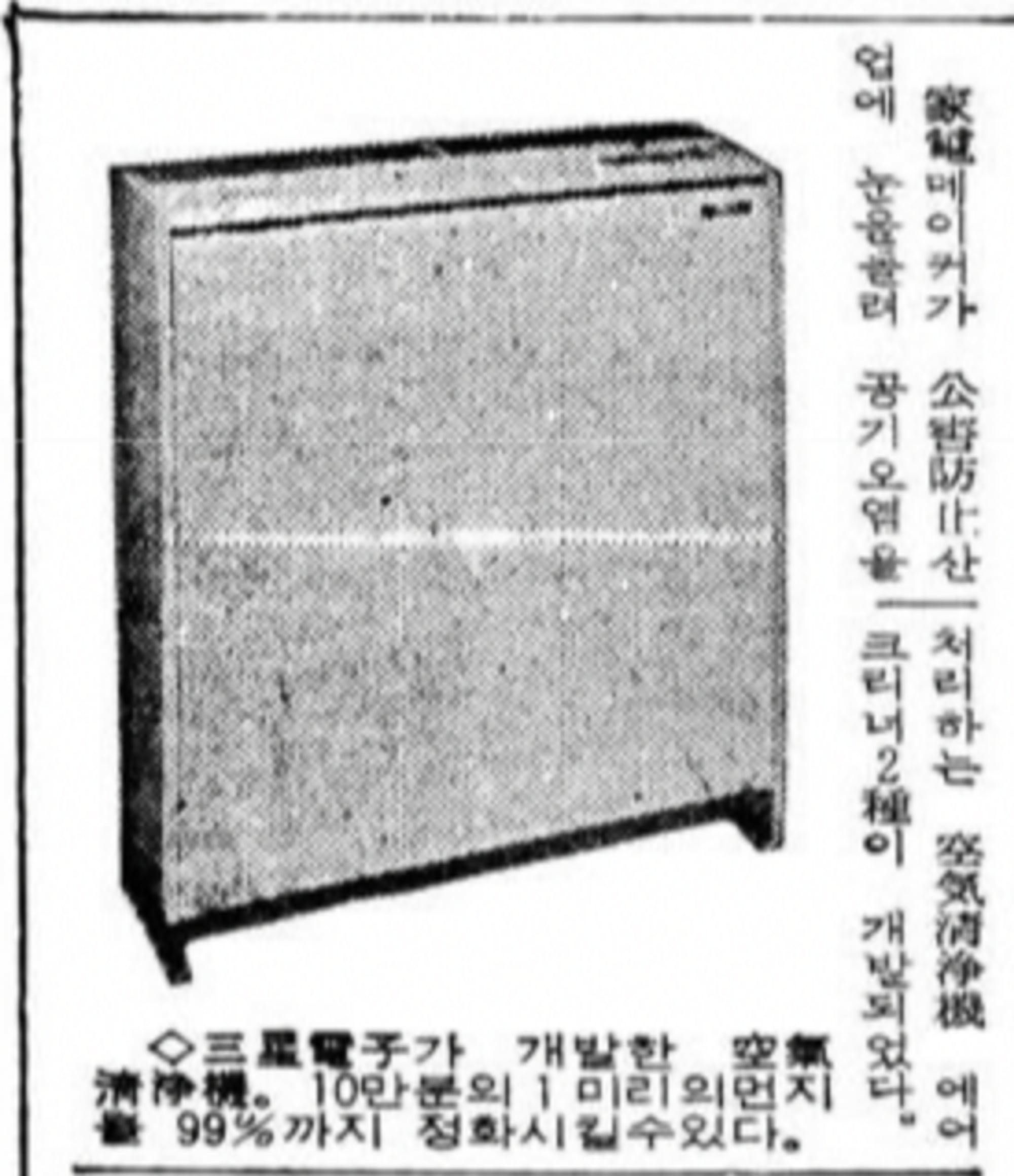 국내에서 최초로 개발된 공기청정기는 1976년 삼성전자에서 나온 것으로 연구기관, 병원 등 특수시설을 위한 장비였죠. 가정용 공기청정기는 1980년대부터 본격적으로 개발되기 시작합니다. 1981년 한우전자에서 음이온 공기청정기를 개발한 것을 시작으로, 1987년 금성(현재는 LG)의 에어 클리닉, 1989년 삼성전자에서 공기청정기를 출시했어요.