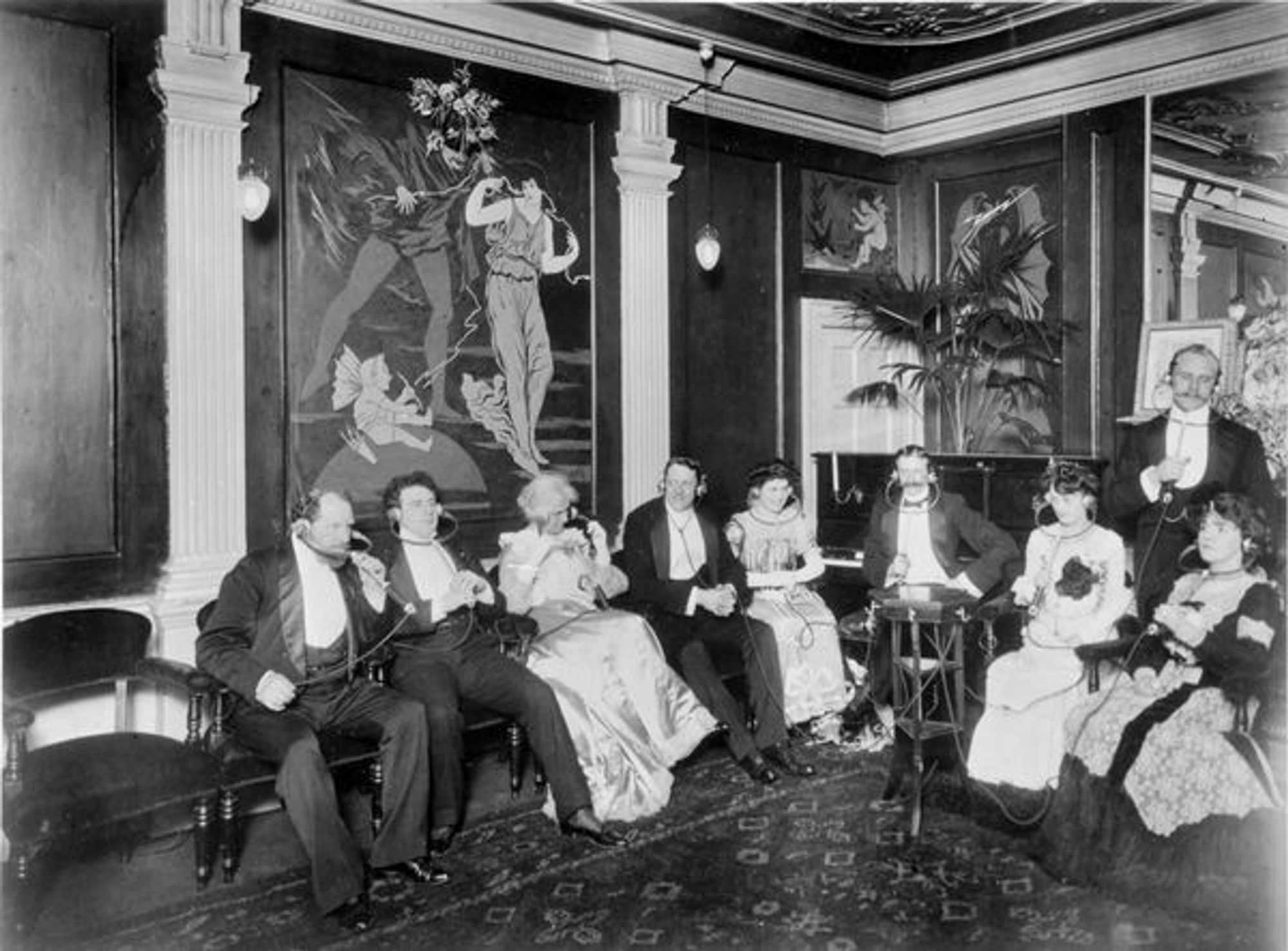 1890년대에는 음악 감상을 위한 헤드폰(?)이 탄생했습니다. 이 장치는 일렉트로폰 회사에서 런던 오페라 하우스에 설치한 것으로 실시간 공연을 더 크게 들을 수 있는 장치였죠. 이 장치를 사용하기 위해서는 별도의 서비스에 가입해야 했어요. (그 시절의 스포티파이라고 볼 수도 있지 않을까…?!)