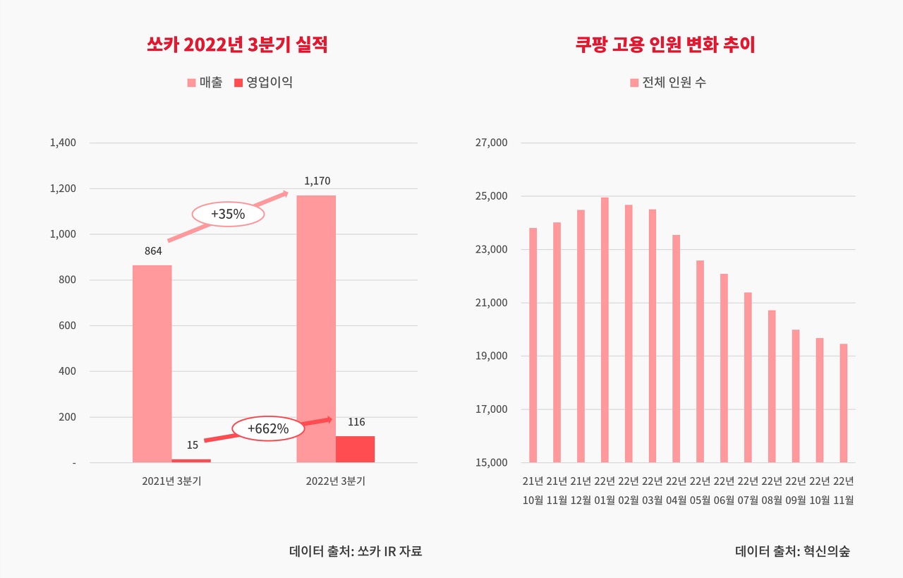 이를 잘 나타내는 지표 중 하나가 쿠팡의 고용 인원수입니다. 혁신의숲이 제공한 데이터에 따르면, 끝을 모르고 올라가던 고용 인원은 작년 1월을 정점으로 오히려 서서히 줄기 시작합니다. 작년 12월부턴 배송 인력인 쿠친을 자회사로 이관하는 등 인력 운영 효율화에도 나서고 있고요.