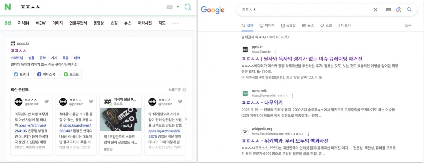 리: 좋습니다. 그러면 검색결과 1페이지 관리는 어떻게 시작해야 할까요?이승환: 일단 네이버, 구글, 유튜브 등에서 우리 회사를 쭉 검색해 봐야죠. 영미권에서는 에고 서치(ego search)라고 합니다. 요즘 챗GPT와 바드에서 본인 이름 검색하는 분들 계시잖아요, 같은 일을 회사 이름으로 하는 거예요.