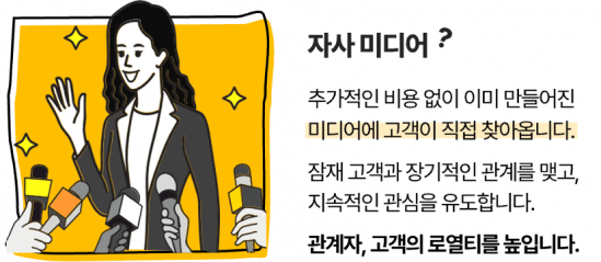 리: 회사에 관해 ‘내 맘대로 쓸 수 있는’ 게 더 있을까요?이승환: 블로그가 있지요. 블로그를 ‘온드미디어(owned media)’라고도 부르는데, 말 그대로 기업이 소유하고 마음대로 운영할 수 있다는 의미입니다. 언론홍보를 하는 분들은 기자들에게 어필할 수 있는 기사거리를 찾기 위해 노력합니다. 그러면서 사소하거나 기사화하기 어려운 내용은 그냥 버리죠. 그러지 말고, 그냥 자사 자사 블로그에 올려도 됩니다.