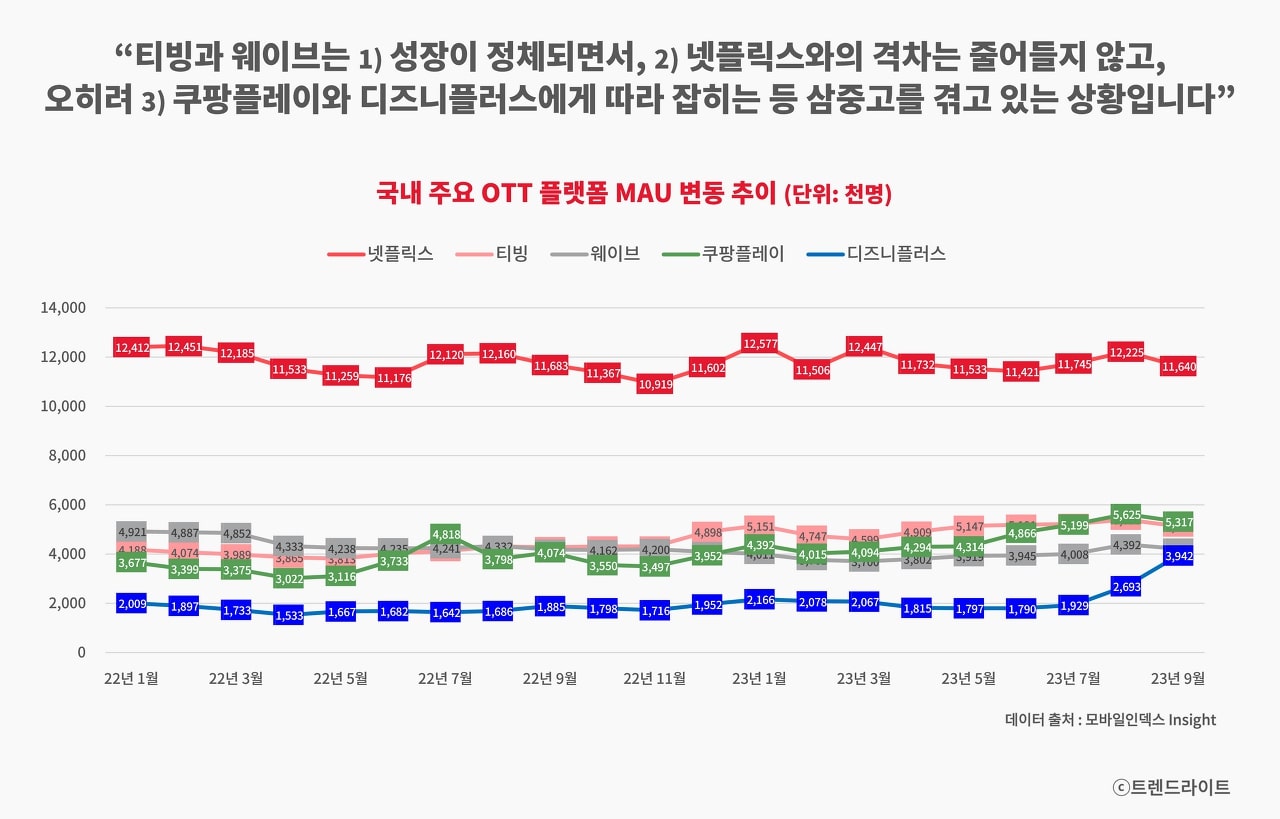 지금처럼 OTT 시장에 위기가 찾아오게 된 것은 엔데믹 이후 성장이 정체되었기 때문입니다. 정확한 유료 가입자 수는 알 수 없지만, 앱 트래픽 데이터를 통해 시장 상황을 어느 정도 추정 가능한데요. 대표적으로 시장 1위 플레이어인 넷플릭스의 MAU는 1,200만 내외에서 성장이 멈춘 상황입니다.