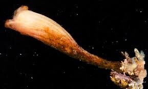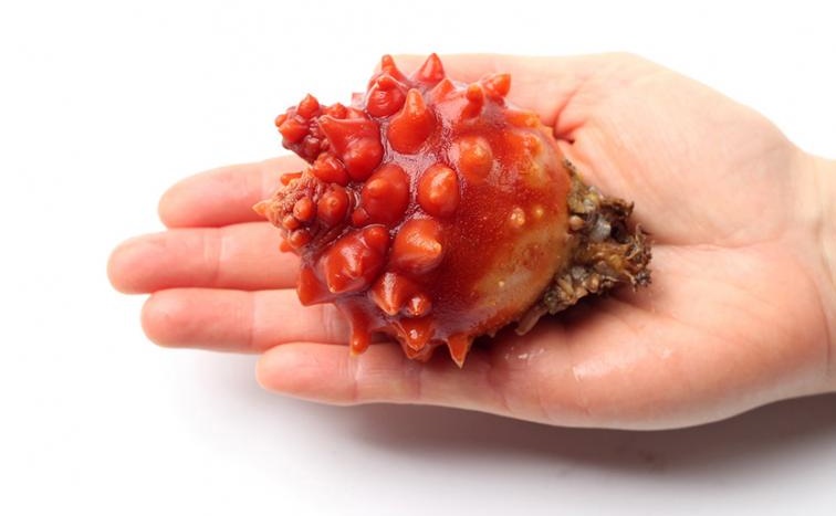 횟집에서 손질하기 전의 멍게는 다들 보셨을 겁니다. 전체적으로는 붉은 파인애플 같은 모양을 하고 있고, 입 역할을 하는 구멍이 있죠. 돌 사이에 뿌리를 내리고 바닷물을 마셔서 플랑크톤 등을 먹는다고 합니다.