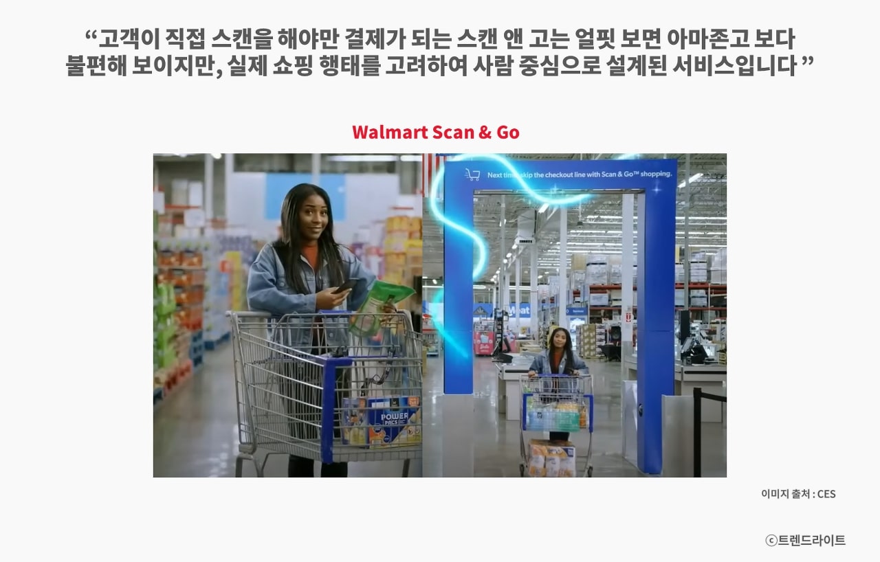 반면에 월마트가 공개한 스캔 앤 고(Scan & Go) 기술은 겉보기엔 그리 특별하진 않습니다. 고객이 쇼핑하는 동안 자신의 모바일 기기로 상품을 스캔하고 결제하는 것이 다죠.