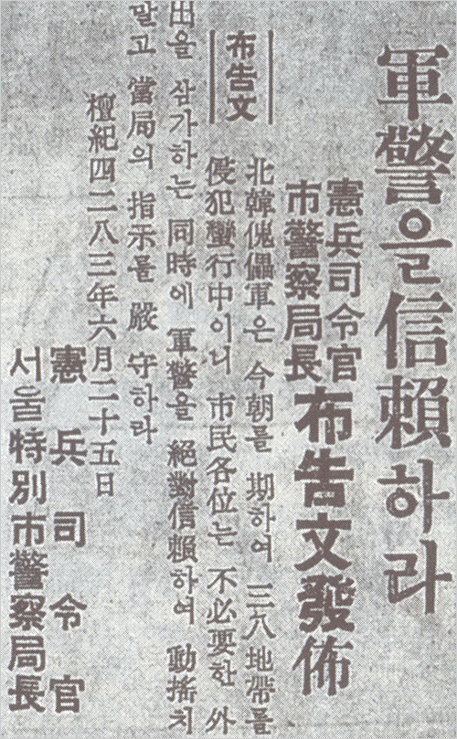 전쟁 발발 뒤 정부의 공식 발표는 6차례에 걸쳐 있었다. 6월 25일 정오에 국방부 담화문이, 6월 26일 새벽 6시에 무초(John Muccio) 미국대사의 입장 발표가, 같은 날 아침 8시에 신성모 국방부 장관의 생방송이 나간 것이다. 이어서 이승만 대통령의 담화가 6월 27일 밤 10시부터 11시까지 라디오로 3번 반복 방송되었다.