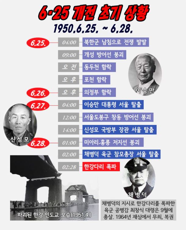 군 지휘라인에 있던 인물들이 끗발 순서대로 한강을 넘은 후 한강 다리가 끊겼다.