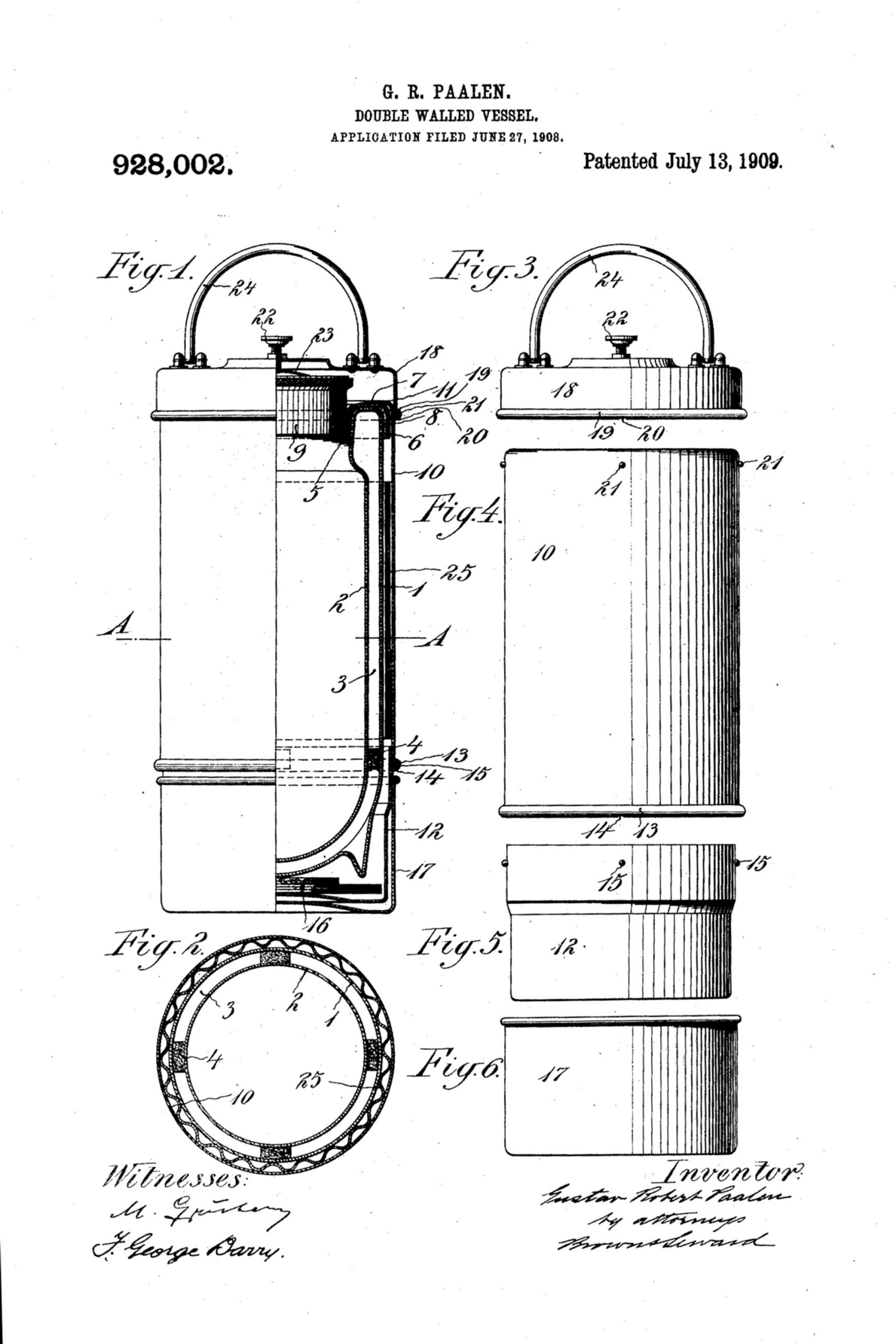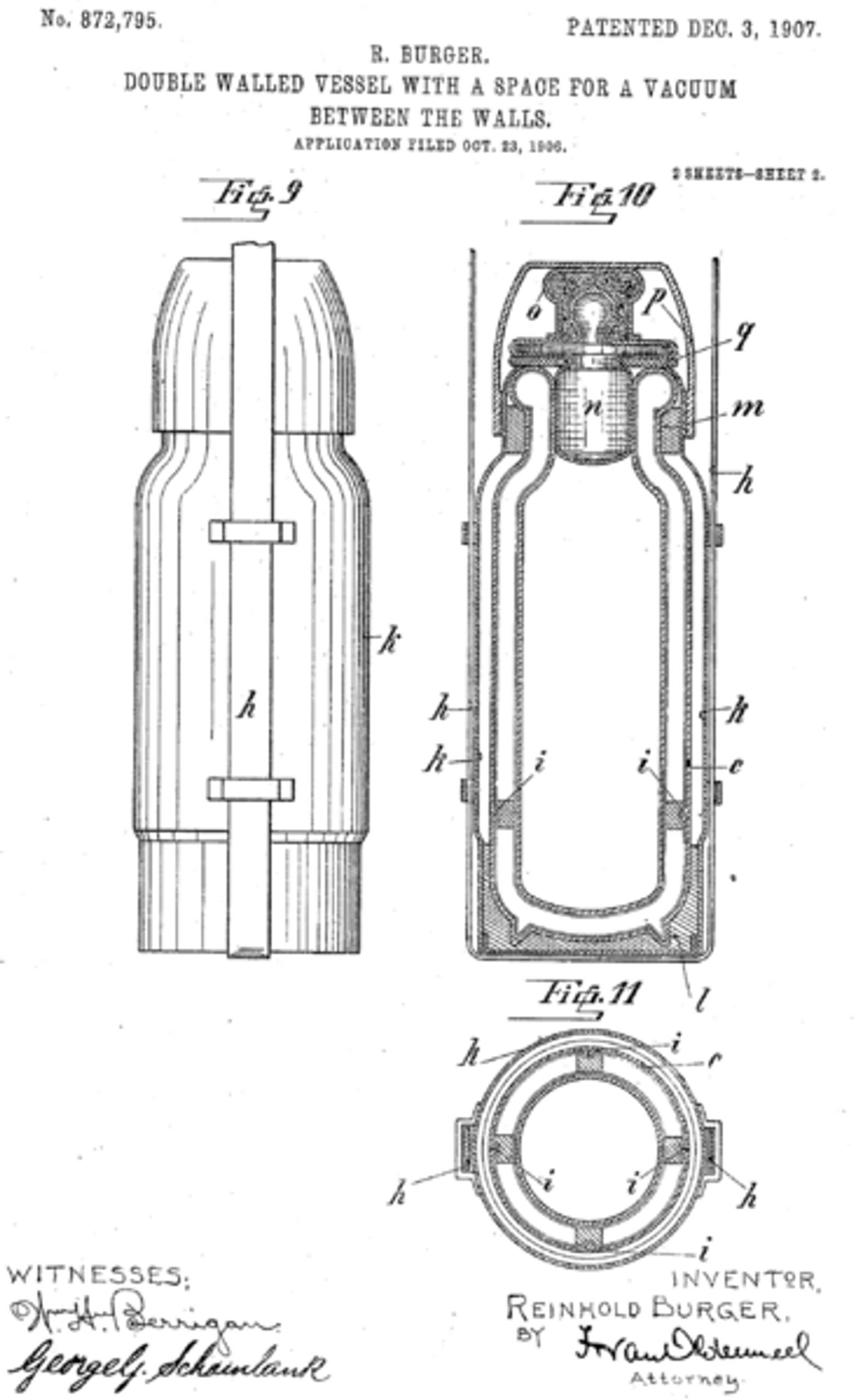 듀어에게 단열 플라스크를 제작해 주던 라인홀트 부르거는 이 단열 플라스크가 일상생활에서도 유용하게 쓰이리라는 것을 직감합니다. 부르거는 단열 플라스크에 보호 금속 케이스를 씌어 1903년 일상에서도 사용할 수 있는 단열 용기에 대한 특허를 받죠. 이듬해에 Thermos라는 상표를 등록하고, 1906년에는 알버트 아슌브레너(Albert Aschenbrenner)와 구스타프 팔렌(Gustav Robert Paalen)과 함께 GmbH* 회사를 설립합니다. 뒤늦게 드워는 자신의 발명품에 대한 지적재산권을 주장하기 위해 소송을 제기했지만 패소합니다. 이후 1907년 써모스 GmbH는 써모스 상표권을 3곳에 매각해 미국, 영국, 캐나다에서 독립적으로 운영됩니다.