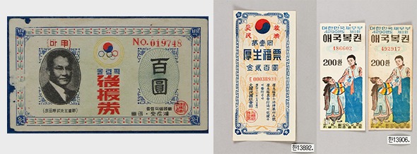 6‧25 전쟁 뒤인 1956년에는 전쟁 복구에 들어가는 산업 자금과 사회 복지 재원을 마련하기 위해 매달 애국 복권을 발행했어요. 매달 1회씩 총 10회까지 운영된 이 복권은 100환짜리와 200환짜리로 발행되었습니다. 그 후 국가적인 이벤트가 있을 때마다 복권이 등장합니다. 1962년 산업박람회복표, 1968년 무역박람회복표 등이 발행되었죠.