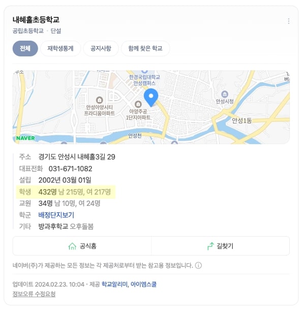 약 두 달 전 보도된 뉴스에 따르면, 최근 3년 사이 학생이 감소하여 문을 닫은 초∙중∙고 학교는 103개나 되고, 지난해 신입생을 받지 못한 초등학교는 무려 145개나 된다고 합니다. 뉴스에서는 이 소식을 심각하게 전달하고 있는데, 막상 주변을 둘러보면 정말 초등학생이 줄어들고 있는 것인지 좀처럼 체감이 되지 않는데요! ‘학생 수가 정말 줄어들었을까?’라는 궁금증을 해결하기 위해, 제가 졸업한 경기 내혜홀초등학교를 검색해 보았습니다.
