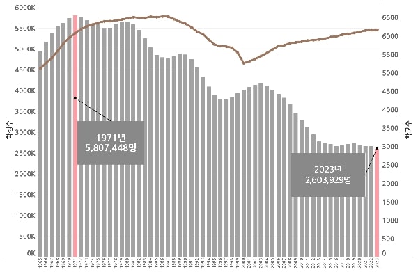 2023년 기준 초등학교는 6,364개 존재하며, 평균적으로 학교 하나당 약 409명의 학생을 수용하고 있는데요. 이 숫자는 지난 시간 동안 어떻게 변화해 왔을까요? 1965년도부터 2023년까지의 데이터 변화를 살펴보도록 하겠습니다.