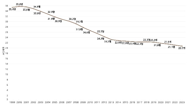 학교 수는 늘어난 데 비해 학생 수가 줄어들었다면, 한 학급의 학생이 전보다 훨씬 줄어들었을 것 같은데요. 지금은 한 학급에 몇 명의 학생이 있을까요? 1999년부터 2023년까지의 학급당 학생 수 데이터로 알아보겠습니다!