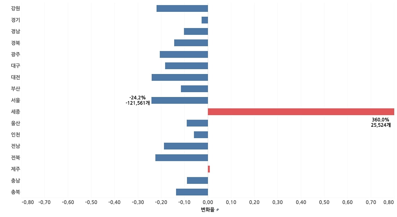 한편, 앞서 언급한 세종특별자치시, 제주특별자치도는 각각 +0.9%(359명), +360%(25,524명) 증가율을 보였는데, 절대적인 수치의 변화는 타 시도의 감소량에 비해 미미한 수준이었습니다.
