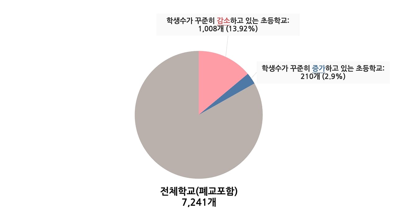 그러나 1,008개(13.92%)의 학교에서는 학생 수가 매년 지속적으로 감소하는 모습을 보여주었는데요! 학생 수가 꾸준히 증가한 학교 210개(2.9%)에 비해 5배 많은 정도였습니다.