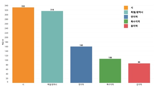 먼저, 지역 규모를 기준으로 특별/광역시, 시, 읍, 면, 특수지역으로 분류하여 분포를 확인해 보았습니다.