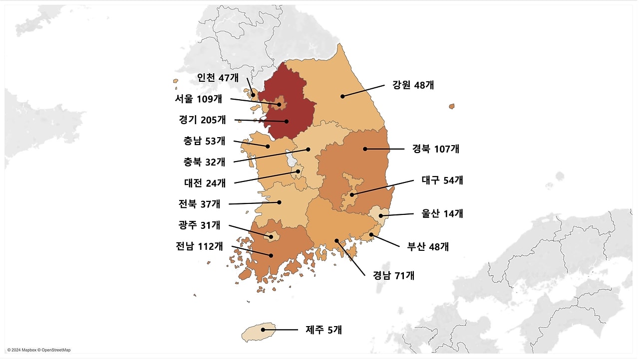 차트를 보면 가장 짙은 색을 띈 지역은 경기도로 전체 1,008개 중 205개의 학교가 분포해 있습니다. 특히 경기도 중에서도 수원에는 32개의 학교가 분포했는데요. 수원은 2024년 1월 기준 경기도 내 인구수 1위임에도 불구하고, 학생 수가 꾸준히 감소한 학교가 가장 많은 지역이라는 점이 흥미로웠습니다.3. 지방 초등학교의 소멸