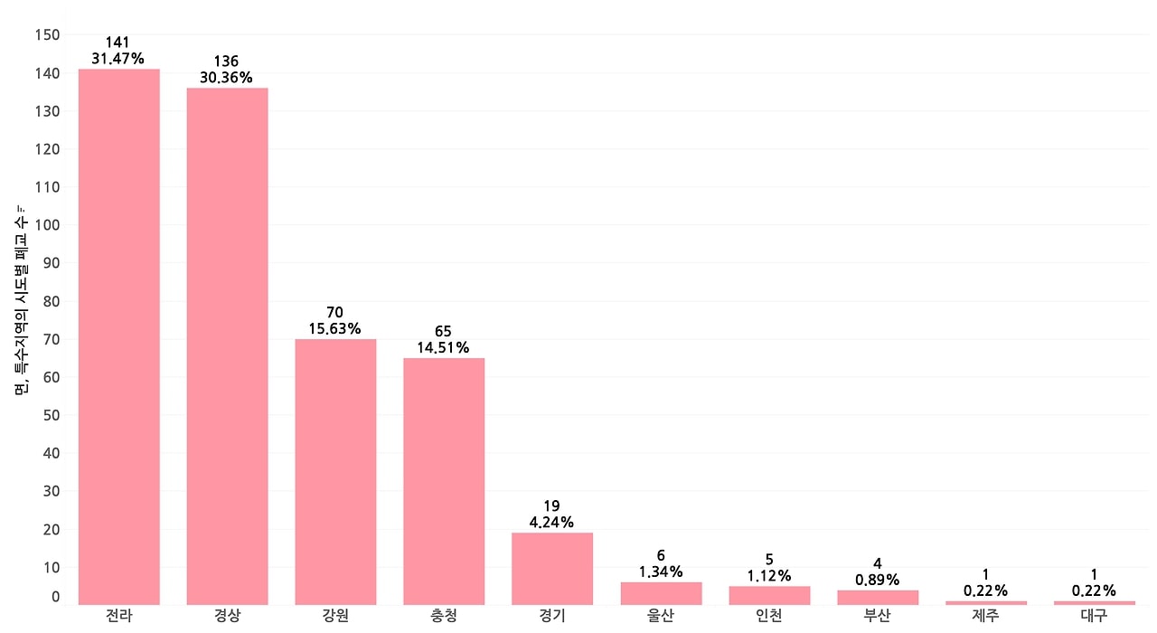 전라도와 경상도, 강원도 순으로 폐교가 많이 분포한 것으로 나타났는데요! 이 지역들은 인구수가 평균 3,000명이 채 되지 않는 면 지역과 섬이나 산에 위치해 발길이 닿기 어려운 특수지역에 위치했다는 특징이 있었습니다. 실제로 전라도의 경우, 문을 닫은 162개의 초등학교 중 141개(87%)는 면이나 특수지역에 있었고, 경상도는 160개 폐교 중 136개(85%)의 학교가 면이나 특수지역에 있었습니다.반면 경기도를 포함한 특별/광역시 지역은 모두 낮은 폐교 수를 보여주고 있는데요. 특히 광주광역시와 세종특별자치시는 단 하나의 학교도 문을 닫지 않았다는 사실도 확인할 수 있습니다. 즉, 인구가 밀집되고 비교적 인프라가 좋은 지역의 학교는 폐교 확률이 낮지만, 지방의 면 지역이나 특수지역의 학교는 문을 닫을 확률이 크다고 해석할 수 있어요.에디터의 한마디