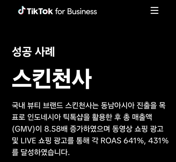 이승환: 해외 쪽 틱톡 광고를 집행하는 분들도 많은가요?김동욱: 네. 해외 수출을 위해 틱톡 광고를 활용하는 경우는 굉장히 많아요. 미국 틱톡 유저가 1억 7천만, 인구 절반이 넘거든요. 그러니까 당연히 광고해야 하는 채널로 여겨지는 거죠. 동남아도 틱톡 사용자가 3억이 넘는데, 한류 열풍이 굉장해서 틱톡이 인기 광고 채널로 자리 잡고 있고요. 그리고 미국과 동남아 모두 틱톡 내 쇼핑몰 ‘틱톡샵’이 굉장히 파워풀합니다.