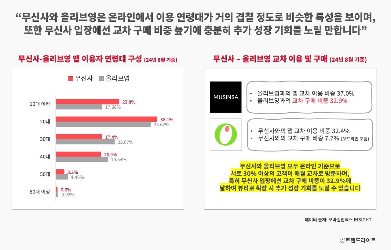 무신사의 '넥스트 뷰티'를 이야기하려면, 왜 무신사가 뷰티 시장을 선택했는가를 이해할 필요가 있습니다. 사실, 올리브영을 대체하려는 시도는 이전에도 온라인에선 쿠팡과 컬리, 오프라인에선 다이소 등이 있었습니다. 하지만 이 중에서 올리브영을 위협할 가장 큰 잠재력을 가진 곳은 무신사라고 보는데요. 그 이유는 무신사와 올리브영의 고객층이 상당히 겹치기 때문입니다.