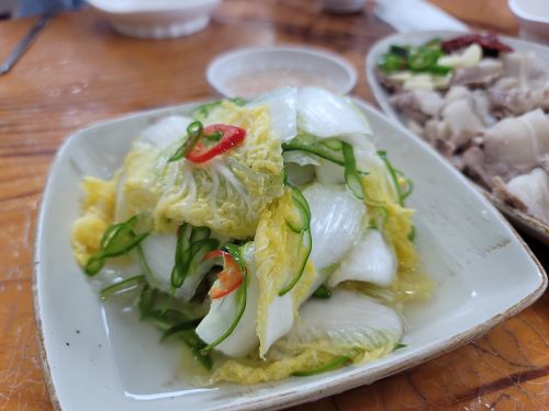 내가 이 식당을 선택한 이유를 일행들에게 브리핑하는 사이 차가운 맥주와 함께 무김치와 백김치가 먼저 도착했다. 요즘 배춧값이 금값이라 김치냉장고 속 시어 빠진 묵은지 말고 싱그러운 배추김치를 마주한 게 얼마 만인지 감격스러울 정도였다. 채 친 풋고추를 듬뿍 올린 백김치를 한 젓가락 집어 들고 대기. 맥주를 한잔 시원하게 들이켜고 백김치를 입에 넣었다.
