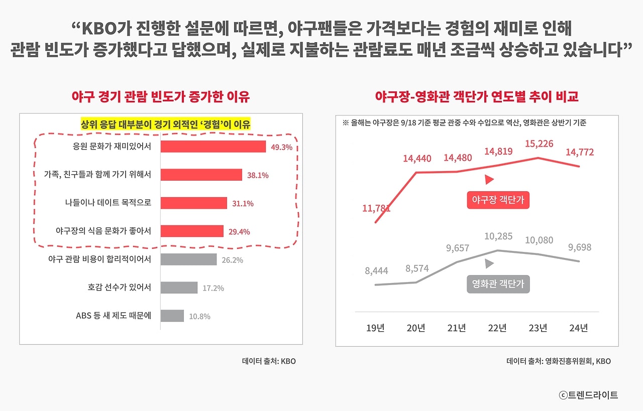 하지만 저는 단순히 가격만으로 흥행을 설명하기엔 부족하다고 봅니다. 예를 들어, 영화관은 관람료 인상으로 침체를 겪고 있지만, 실제로 야구 경기의 객단가는 더 높습니다. 올해 영화관의 객단가는 9,698원이지만, 야구장은 평균 14,772원이거든요.