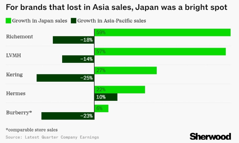 아시아 매출이 전반적으로 감소했다고 보고한 많은 럭셔리 브랜드 중 일본만이 유일하게 선방한 것으로 나타났다. 하지만 그 안에서도 패션 업계 임원들이 반복적으로 언급하는 한 가지 유행어가 있었다: 바로 중국이다.