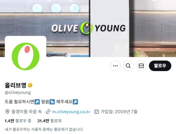 이처럼 우리가 매일 마시는 커피 한잔, 그리고 커피를 받을 때 건네는 친절한 인사말 하나에도 이러한 경영 전략이 숨어 있다는 사실, 재밌지 않으신가요? 스타벅스가 ‘제3의 공간’으로 자리 잡기 위해 가장 중요하게 여긴 건 바로 예측 가능함입니다. 익숙한 공간이어야 편안함을 느낄 수 있으니까요. 이를 위해서는 매장 운영 방식과 직원 대응 방식의 표준화가 필수적이고, 결국 직영점과 정직원만을 고수하는 현재의 운영 방침으로 이어지게 된 겁니다.더욱이 이런 전략은 스타벅스에만 국한된 이야기가 아닙니다. 혹시 올리브영 X 계정을 보신 적 있으신가요? 프로필에는 다음과 같이 쓰여 있습니다.