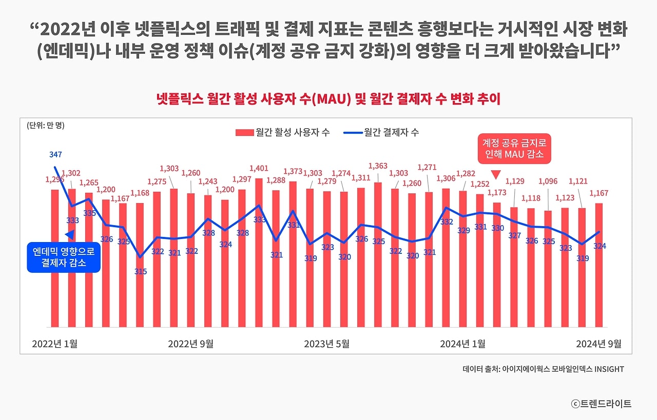 OTT 구독료 인상이 전체 시장을 위축시키는 상황에서도 이러한 경향은 두드러졌습니다. 사용자들이 '하나만 남긴다면' 넷플릭스를 유지하려고 하면서, 유료 구독자 수는 크게 변화하지 않았는데요. 이로 인해 흥행작이 없어도 구독을 유지하는 사용자가 많은 반면, 새로운 히트작이 나와도 신규 결제자가 급격히 늘지는 않았던 거죠.그렇다면 MAU는 왜 올해 들어 갑작스럽게 감소하면서 티빙에게 추격의 여지를 내주었을까요? 사실 넷플릭스의 MAU가 급감한 시점은 올해 2월 이후로, 이는 넷플릭스가 계정 공유 금지 조치를 모바일까지 확대하면서 발생한 현상입니다. 콘텐츠 흥행보다는 계정 공유 금지 같은 정책 변화가 사용자 수 감소에 더 큰 영향을 미친 셈입니다.