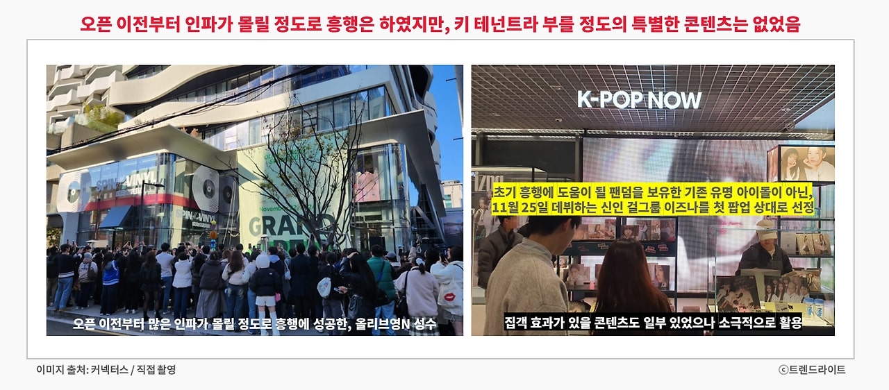 ※ 키 테넌트그렇다면 올리브영N 성수는 어땠을까요? 우선 콘텐츠 면에서, 올리브영은 '올리브영N'이라는 이름 하나로도 충분하다는 자신감을 보여줬습니다. 이번 오픈을 위해 특별히 '모셔온' 콘텐츠는 딱히 눈에 띄지 않았고, 올리브영이라는 브랜드 자체가 전면에 나섰습니다.상업 시설에서 고객을 끌어모으는 핵심 점포, 브랜드를 뜻하는 용어